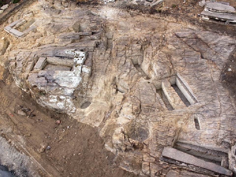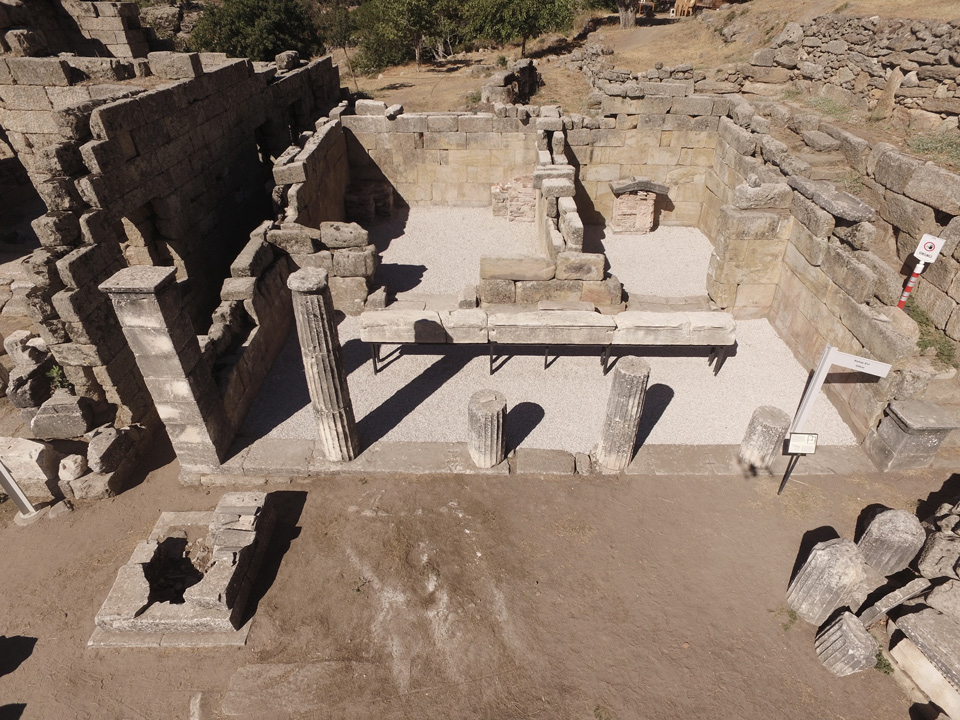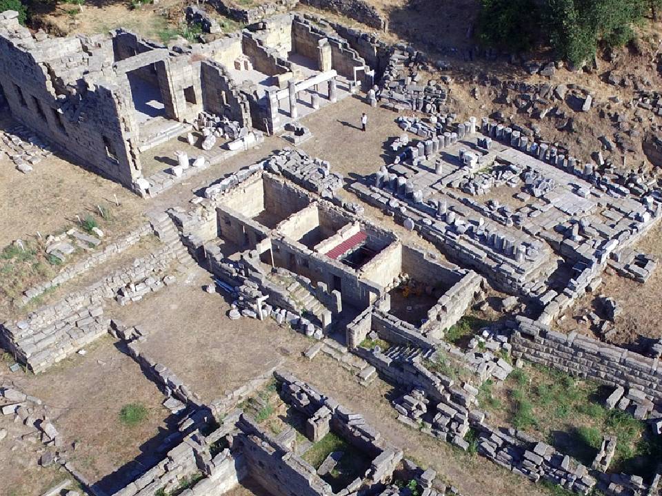 Fin de l’ancien culte païen et christianisation du sanctuaire. Plusieurs églises sont construites, L’acropole et les bâtiments du sanctuaire sont réoccupés (Andron A, Terrasse M).